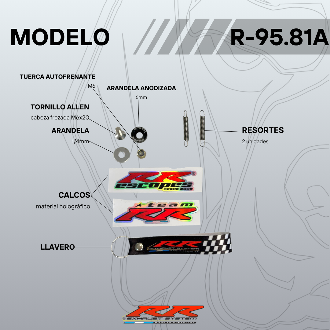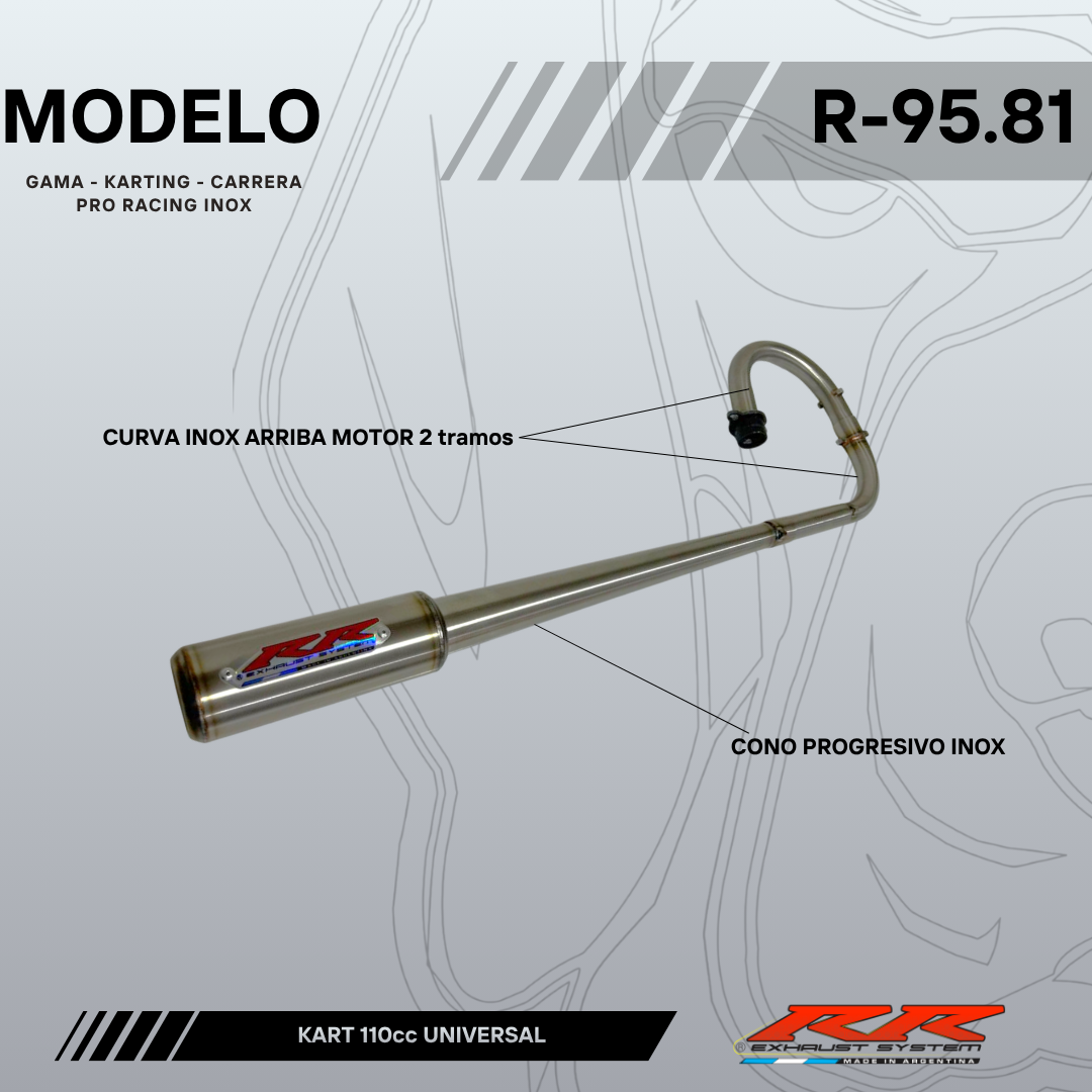 Modelo R-9581A para karting universal 110cc – acero inox – cono progresivo – contracono – silenciador inox 58mm x 150mm – curvatura 2 tramos ARRIBA MOTOR.