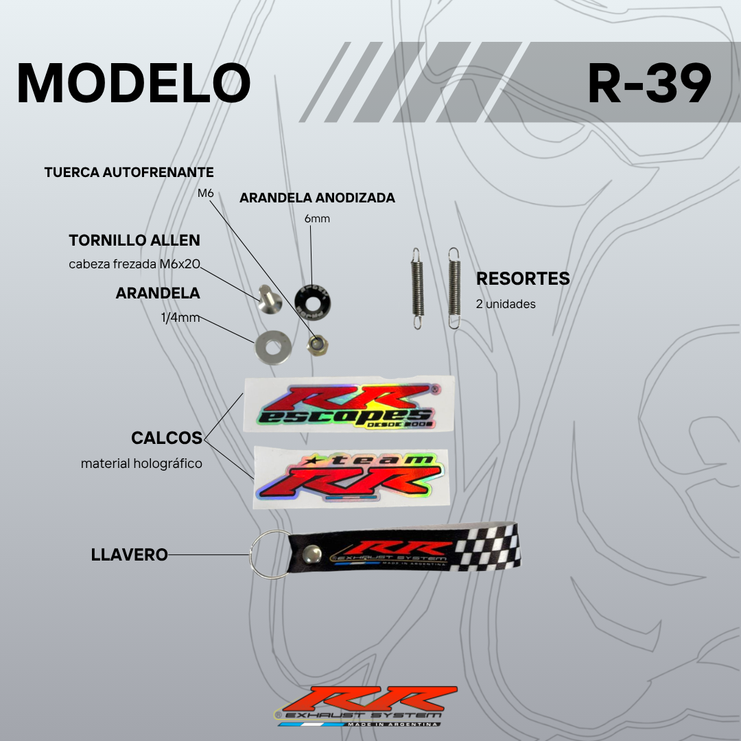 Compuesto por curva INOX 25.4mm + cono progresivo + silenciador de aluminio D=76mm x L=209mm.
