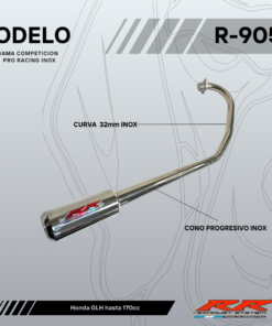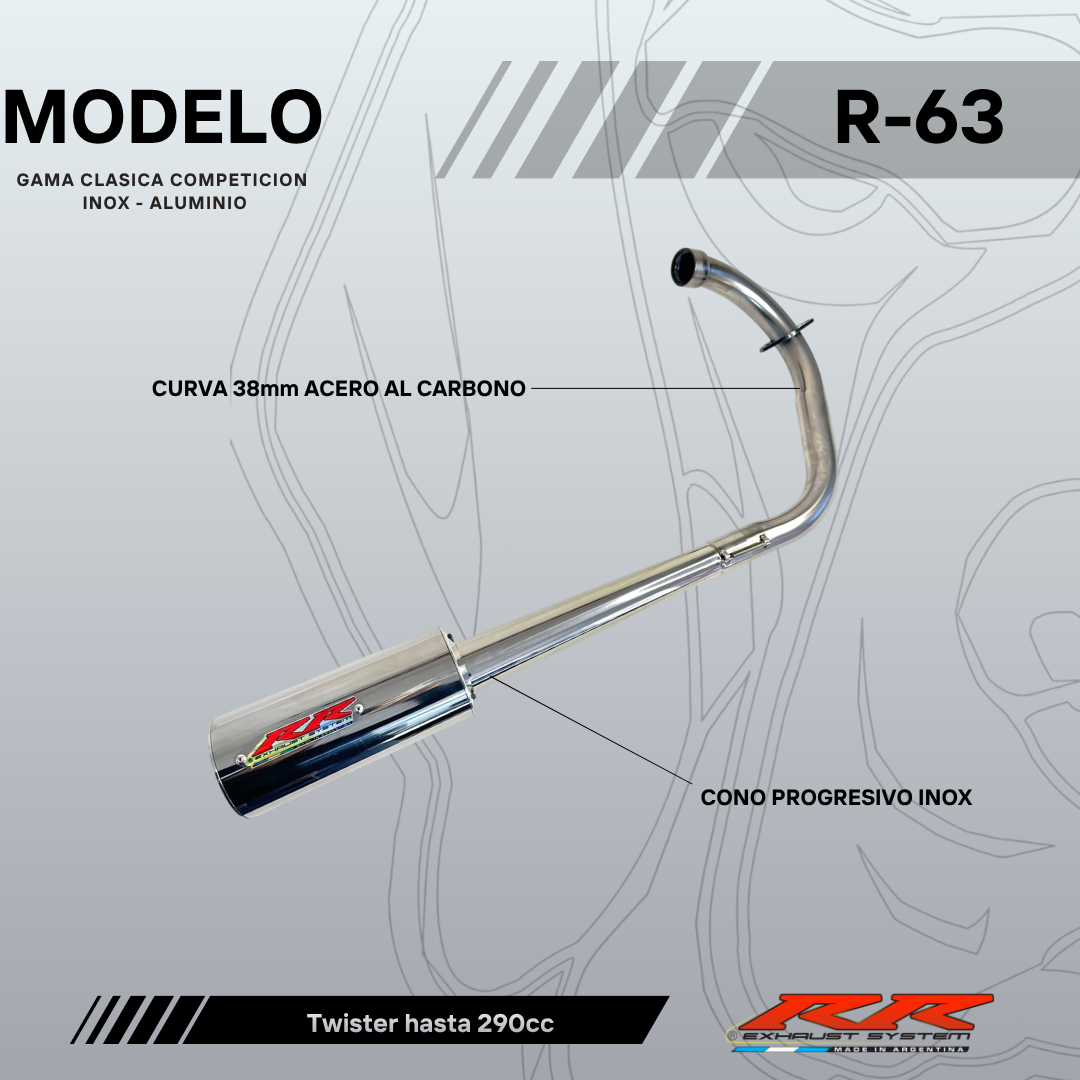Curva de 38mm (caño común) + cono progresivo + silenciador de aluminio.