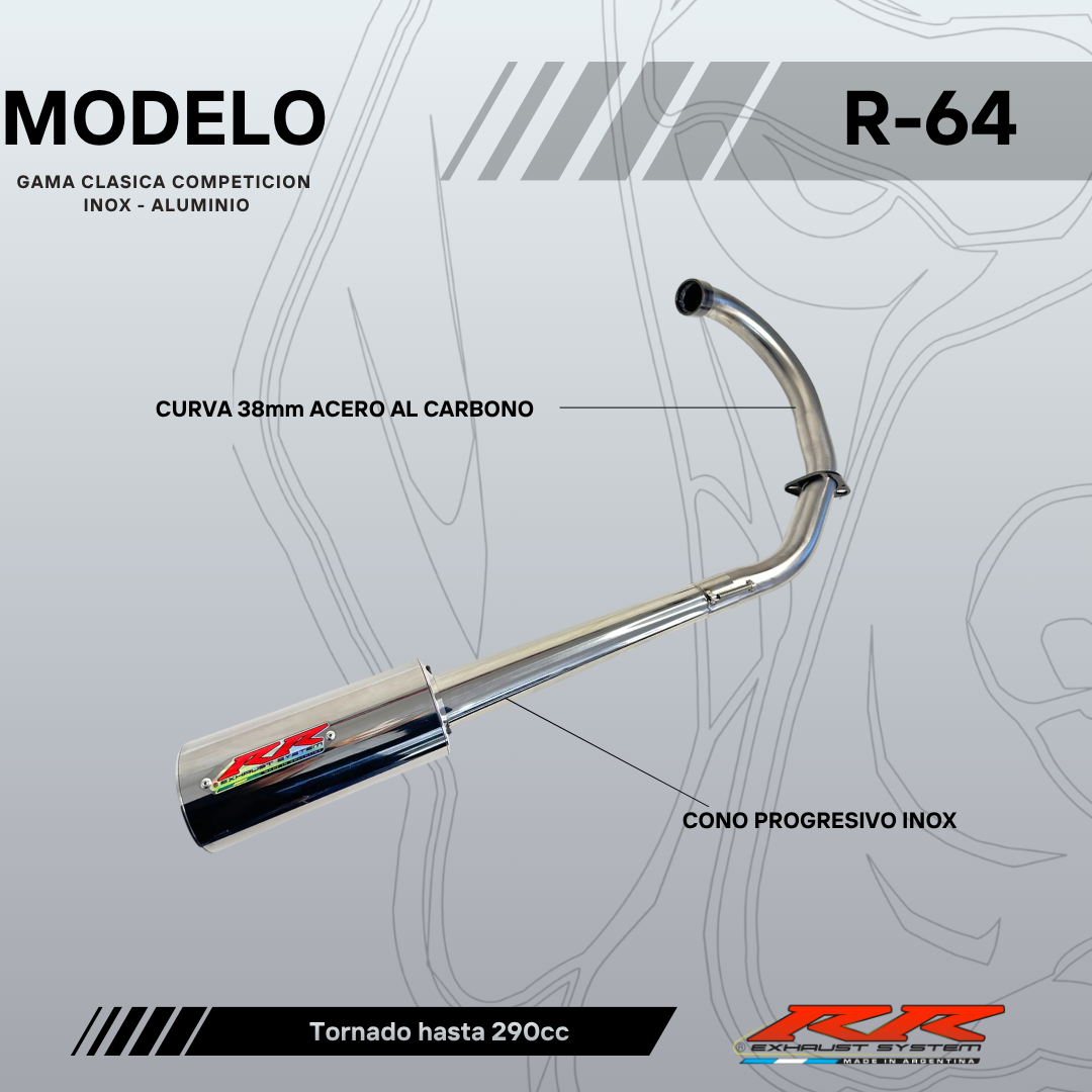 Curva de 38mm (caño común) + cono progresivo + silenciador de aluminio.