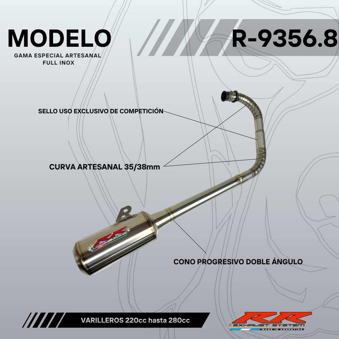 Compuesto por curva de doble diámetro (35mm-38mm) + cono progresivo doble ángulo + silenciador 88mm x 170mm.